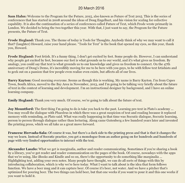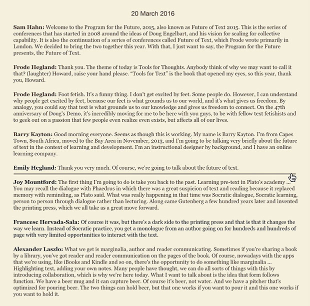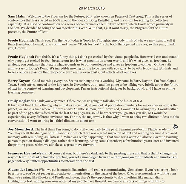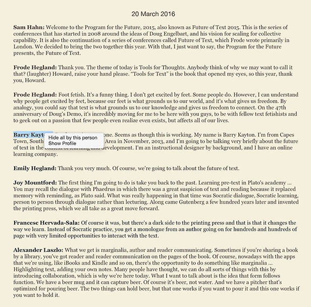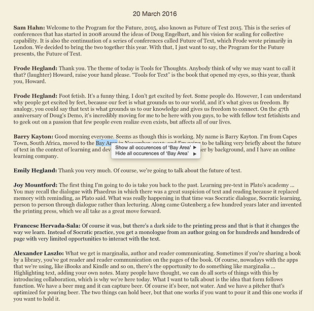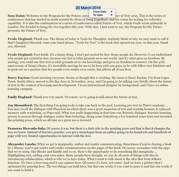 Liquid is a tool Frode Hegland developed for OS X based on Doug Engelbart's Augment, which is suggested as a useful method for text interaction in Time Browser and other applications. In Augment you issue commands based on typing keyboard sequences. You can hit '?' to see all the possible commands for where you are in the command you are constructing. Liquid simply reverses this: Select text, keyboard shortcut and a list of possible commands are displayed, though you can fly through them so quickly once you know how to use the system that it no longer needs the visual aspect. Please have a look at demos at www.liquid.info
