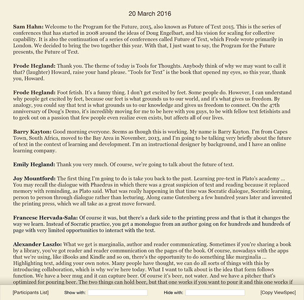 Please note that the visual presentation of identities of the participants will be an important future enquiry, where avatar pictures, renderings and more will be looked into. Further end-user visual choice should include framing of participants to see what country they are from, with a badge maybe, maybe the sex of the participant should be indicated with a colour frame, perhaps the rank of a participant should be shown and so on. The visual representation of the participant should not be limited to the area on the side, but perhaps also cover their full text in a wash somehow.